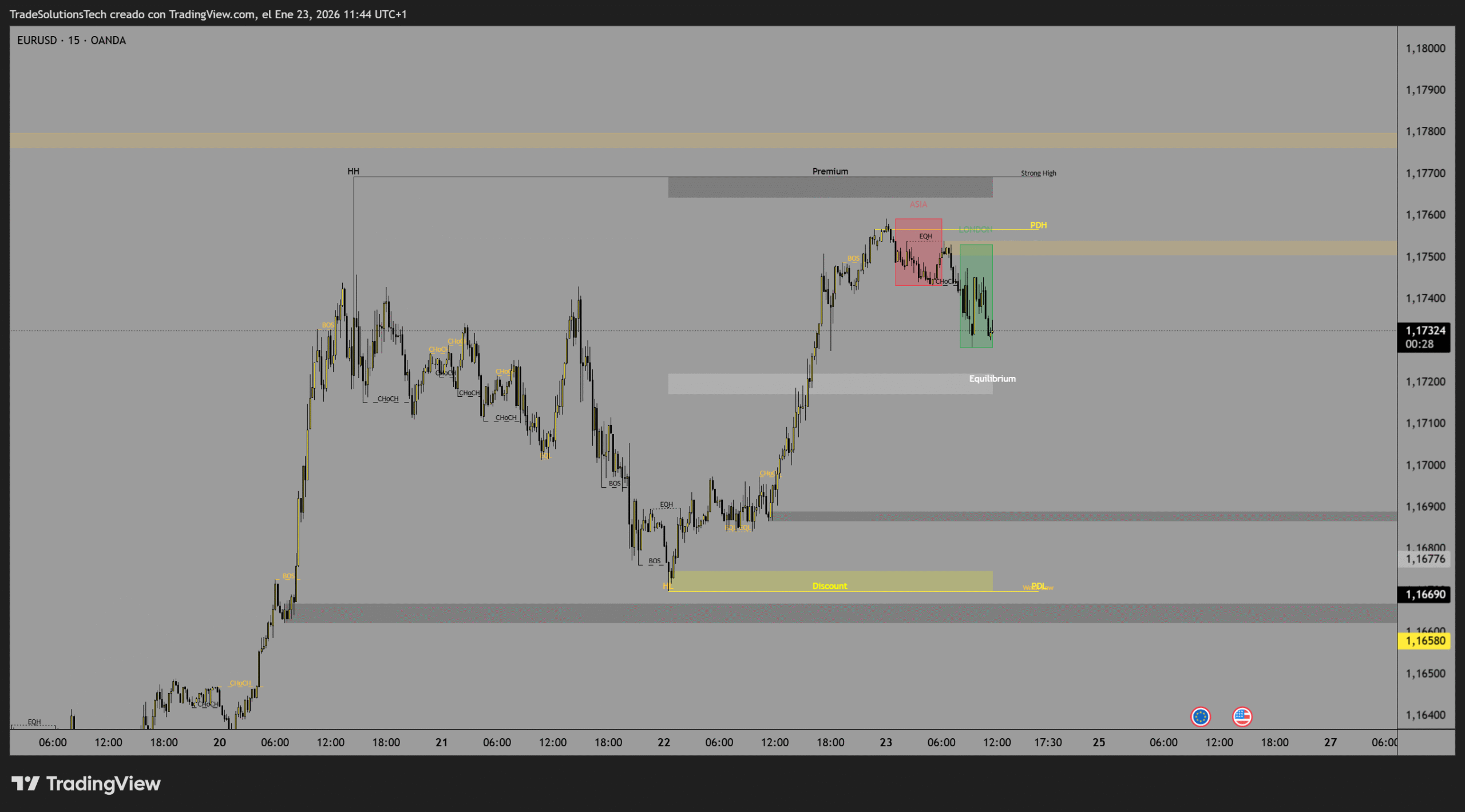 Marcado de Premium & Discount Zones (equilibrio, sobrecompra y sobreventa) basadas en los extremos de swing más recientes.